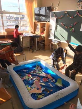 コイン落としや、輪投げ、ワニたたき、豆うつし、折り紙、魚釣りなど盛りだくさんです。どのクラスも、道具が色鮮やかに工夫されていて楽しい空間が待っています。(真田)