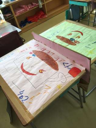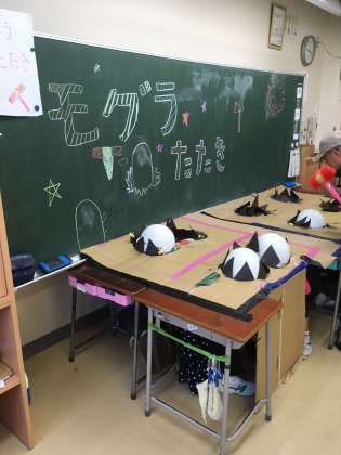 4年生は、おとぎ話の世界、スマッシュココアーズ、推理ゲーム&モグラ叩きです。オリジナルの卓球台や、モグラ叩きが用意されています。新記録を目指して白熱しています。おとぎ話の世界ではどこかで見たような本格的衣装や道具が...(真田)