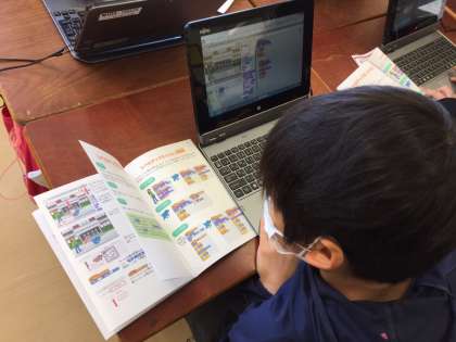 あっという間に理解し、慣れる子供たち。パンフレットを見ながら自分で考えてプログラミングしています!夢中になっていて、気軽に話しかけられません。(江舟)