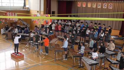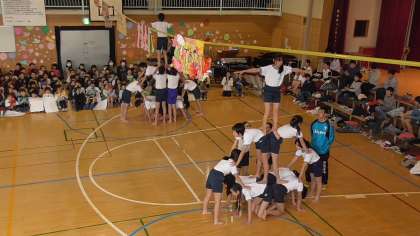 6年生から、感謝の気持ちを表わすだしものです。強い団結力を表わす組み体操。真剣に取り組む姿から、6年生の思いが伝わってきます。技がきまるたびに歓声がわき起こりました。スライドショーでは、6年間を振り返りながら感謝の気持ちを伝えます。合奏の曲は「スターウォーズ」です。堂々とした演奏がとても魅力的でした。(真田)