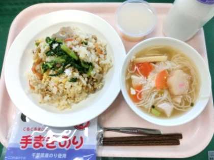 今日の給食では千葉県産の手巻き海苔でちらしずしを巻いて食べる「手巻きちらしずし」、お花の形の麩やそうめんなどが入った「花麩とそうめんのすまし汁」、白桃の缶詰めを使った「桃カルピスゼリー」でした。一人4枚ずつ入った個包装の手巻き海苔はパリパリで風味がよく、とても美味しかったようです。給食後に「今日の給食で何が一番美味しかった?」と1年生に尋ねると、意外にも「すまし汁!」と応える子が多くいて、とても嬉しく思いました。