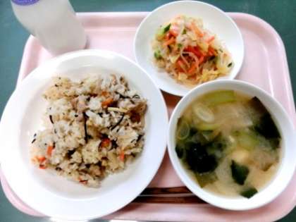 ごはんはどのクラスもとてもよく食べていました。サラダに使った国産春雨は、中国産の緑豆春雨に比べるとコシがなく太めで、味がしみ込みやすいという特徴があります。手づくりの中華ドレッシングがピリ辛に仕上がってしまったので、春雨に味がしみて、辛いのが苦手な人には少し食べにくかったようでした。