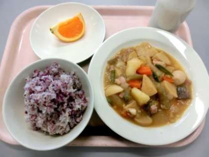 29年度の給食が今日からスタートしました。進級の春を意識して、初日のメニューは鮮やかな色が食欲をそそるゆかりを混ぜたごはん、今が旬の春野菜を使った煮物、デザートは旬の清見(オレンジ)でした。ふきの特有の香りに苦戦している子もいましたが、全体的には残りが少なくよく食べていました。