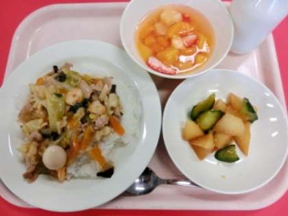 中華丼にはたくさんの野菜、肉、魚介、うずらの卵も入り、一つの料理でたくさんの食材がとれて栄養満点です。たくさんの食材が入っている分、「苦手なものが入っている・・・」と思う児童もいたかもしれませんが、全体的にはよく食べていました。