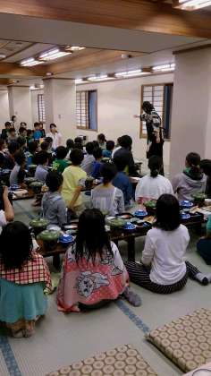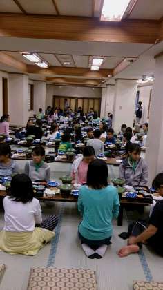 1日目夕食です。明日のためにたくさんいただきましょう、といただきますの係よりあいさつがありました。みんな元気です。