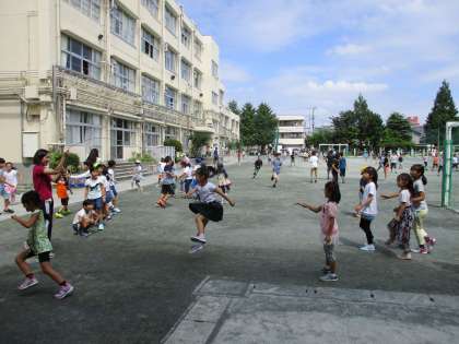 中休みには長なわで遊ぶクラスが多いです。低学年も割と速いスピードで連続跳びに挑戦していました。元気いっぱいの校庭の様子です。