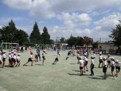 子どもたちは「ハイ ハイ ハイ ハイ」と声をかけ合いながら、調子よく跳んでいます。クラスが一つになって、たくさん跳べるようがんばっています。