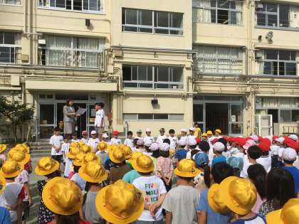 晴れた空のもと、久しぶりに校庭で朝会が行われました。