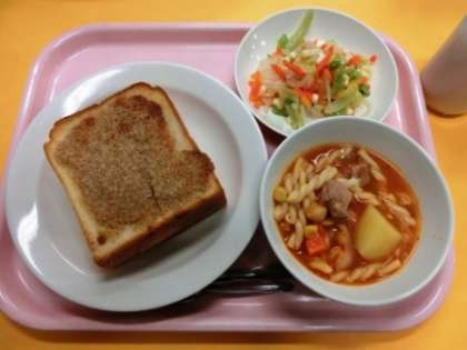 主食の「セサミトースト」は白すりゴマ、砂糖、バターを合わせたものを食パンの表面に塗って焼いています。副菜2品の共通点はイタリアです。「ミネストローネ」はイタリアの家庭料理を代表するスープです。「イタリアンサラダ」の味つけには、イタリア料理によく使われるチーズとバジルを組み合わせています。ドレッシングにバジル粉末を使い、小さなサイコロ状のチーズをトッピングしています。