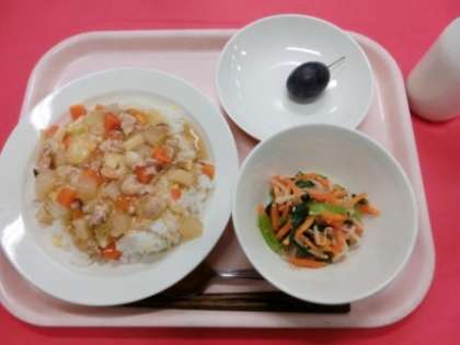 今日の果物は生のプルーンでした。ドライフルーツはいつでも外国産のものが出回っていますが、国産の生プルーンは旬の時期にしか味わえません。「食べたことがほとんどない」という人が大人でもいるので、昨年給食で出した時には食べずにかなりの数が残ってきました。「食べたことがないものでも一口は味わってみる」ことの大切さを給食を通して伝えるため、旬の時期に1度は出すようにしています。先月、給食に生プルーンを出したところ残りが少なく、1年生からも「初めて食べたけど、意外と美味しかった。」という感想をもらいました。今回は今年2回目の登場でしたが、1年生もほとんど残さず食べていて、フレッシュなプルーンの美味しさを味わってもらえたようです。