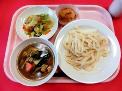 今日は雨の冷たい一日となり、校舎内もかなり冷えました。こんな日に、とろみのついたカレー味の温かいつゆにうどんをつけて食べる『カレーつけうどん』は大人気でした。また、紅玉で作った『リンゴマフィン』もとても好評で、どのクラスもお代わりじゃんけんをしていました。