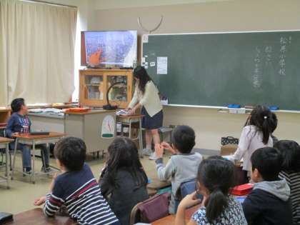 松原小も82歳のお誕生日だね、ということで、みんなで松原小学校副読本「まつばら」で、松原小の歴史や開校当時の様子についてなど、学びました。