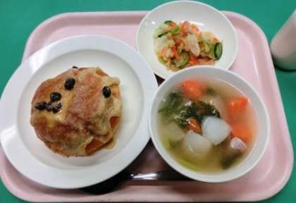 「和風ビスキュイパン」はバター、鶏卵、小麦粉、すりごまなどで作ったビスケット生地を丸いパンにのせ、甘納豆をトッピングして焼いたものです。高学年のパンは焼き時間が短くてカリッとせずにベタッと仕上がってしまったのが残念でした。次回はカリッと仕上がるように改善します。