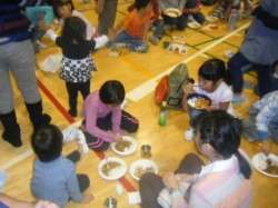 作ったのカレーをかけて、体育館で夕食タイムとなりました。