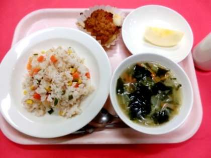 「チキンとポテトのタンドリー風」は、一人分ずつの耐熱カップに、蒸したジャガイモを敷いて、上にタンドリーチキンの味に漬け込んだ鶏肉の切り身をのせてこんがりとオーブンで焼いた料理です。ピリ辛で低学年にはどうかな?と思いましたが、大好評でした。