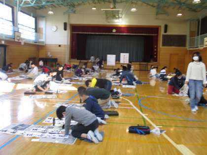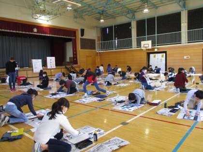 体育館の冷たい凛とした空気を感じて、心を落ち着かせ、毛筆で書き初めを行いました。