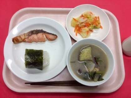 学校給食週間3日目は、給食が始まった当初の給食を再現しました。給食の始まりは明治22年。山形県鶴岡町で僧侶がつくった小学校において、貧困児童のために「おむすび・焼き魚・漬物」の昼食が無料で配布され、これが学校給食の始まりとされています。