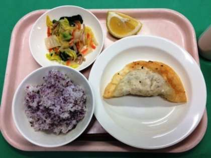 今日は伊豆諸島でよくとれる「ムロアジ」のミンチを使ってジャンボぎょうざを作り、伊豆諸島の海でとれたテングサから作られた「糸寒天」を中華サラダに入れました。