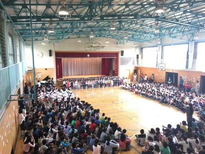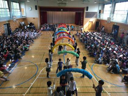 代表委員を中心に、全校で一年生を歓迎する会を行いました。5年生のつくる花のアーチを、6年生に手を引かれて1年生がくぐります。代表委員が、松原小のルールを楽しくクイズで紹介したり、4年生からのプレゼントが送られたりしました。1年生はお礼の気持ちをこめて、手話ダンスを披露しました。初めは2〜6年生を目の前にして、緊張した顔をしていましたが、会の中でたくさん笑顔を見ることができました。