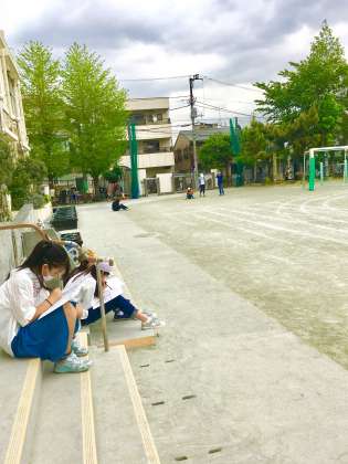 校庭に出て松原小のスケッチをしました。「これまでの5年間を振り返りながら、お気に入りの場所をスケッチしよう。」体育館をメインにしたり、去年使っていた教室がある校舎を中心に描いたり。一人一人、注目する場所が違います。3クラス合同の授業なので、いつもとは違うメンバーの作品をお互いに見合う事ができました。