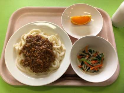 ひき肉とみじん切りの野菜をたっぷり入れて炒め、甘辛みそ味に仕上げた「肉みそ」をうどんにかけて食べる「肉みそうどん」は学年を問わず大人気でした。1年生の中には初めて食べるからと最初は少なめで盛り付けていた子も、後からお代わりしてモリモリ食べていました。