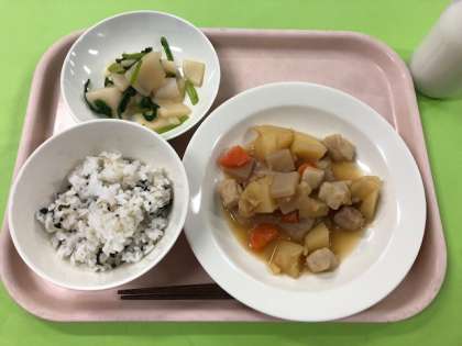 今日は子どもたちに人気のある「わかめごはん」、高野豆腐やこんにゃくの入った「肉じゃがうま煮」、それに茹でたカブとカブの葉をレモン汁としょうゆであえた「カブのレモンしょうゆかけ」というメニューでした。カブの副菜は見た目で食べられる自信がないのか、1年生は「減らしたい人」の列が長蛇になっていました。少しずつ、副菜のメニューに食べ慣れてもらえたらと思います。
