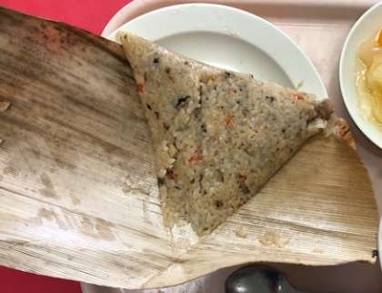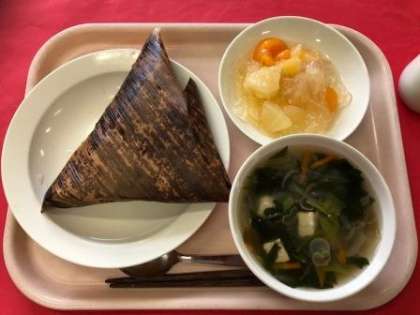 明日から連休ですが、連休中の5月5日は端午の節句。国産の立派な竹の皮が手に入ったので、今日の給食では手作りの中華ちまきを1人1コずつ作りました。全部で700コもの中華ちまきを5〜6人の調理スタッフで作るのはとても大変な作業でしたが、子どもたちは滅多に見ないような立派な大きさの中華ちまきに大興奮でした。