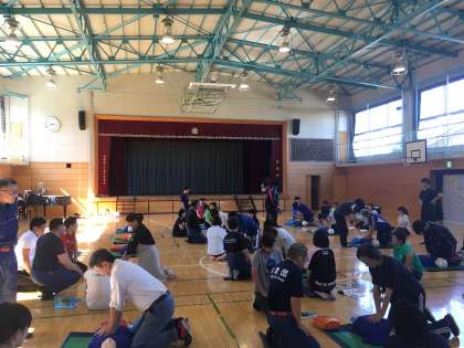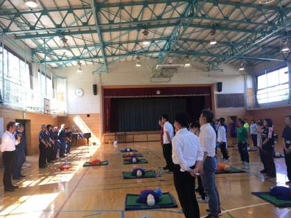 年に一回の救命救助講習がありました。講義に加え、心肺蘇生の実技も行います。教職員、主事が、参加して万が一の時もしっかりと対応できるよう