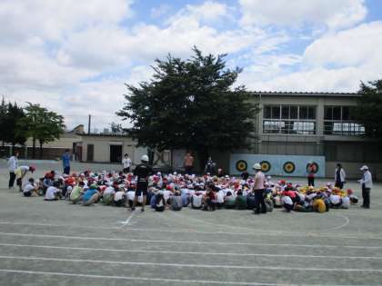 休み時間の訓練で、非常放送を聞いて自分で考えて避難行動をとります。校庭で遊んでいた子どもたちは、放送が入るとすぐにその場にしゃがみました。校庭に避難してからは、全校で集まって静かに話を聞きました。