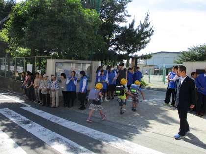 6年生や地域の方々と一緒に、大きな声で「おはようございます」と登校してきた子どもたちに声をかけてくれました。