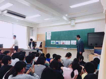 税理士の方をお呼びして、税についての学習を行いました。税には、50種類もあることを知り、驚いていました。また、税金がないと生活にどんな影響があるのかも知り、大切さを学びました。