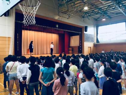世田谷区はオリンピックのアメリカ選手が滞在するホストタウンになっています。世田谷区の小学生の意見によって、ホストタウンのデザインが決まります。校長先生からデザインの紹介がありました。