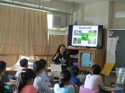 東京農業大学の先生と学生さんに稲作りについて教えてもらっている5年生です。