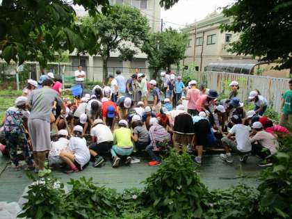 そのあと、プールの東側にある学校田で、土を柔らかくしたり石などを除いたりする体験を行いました。