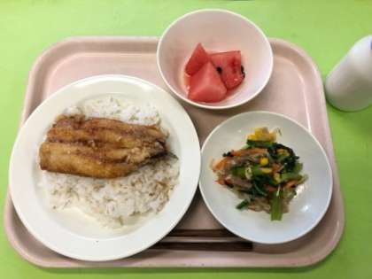 今日は日本一のイワシの水揚げ量を誇る銚子でとれたマイワシの開きで蒲焼きを作りました。甘辛い蒲焼きだれでご飯がすすみモリモリ食べている児童もいれば、お魚というだけで苦手意識があって食べるのに格闘している児童もいました。