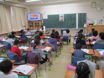 4時間目の授業は1,2年生が教材名「ふるさとを 歌に」で内容項目は「国や郷土を愛する態度」です。3年生は教材名「いつもありがとう」内容項目「感謝」、4年生は教材名「ぼくの草取り体験」内容項目「勤労、公共の精神」です。5年生は教材名「サタデーグループ」内容項目「勤労、公共の精神」、6年生は教材名「母校大発見」内容項目「よりよい学校生活、集団生活の充実」です。いずれも、5時間目のパネルディスカッションにつながる内容としました。