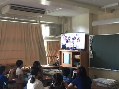 テレビ放送で、松原子ども会で行うお店のアピールを各クラスの代表児童がしました。衣装やセリフにこだわってユーモアたっぷりに自分のクラスのお店を紹介します。5年3組では笑いもわきおこり、楽しく見ていました。自分のお店を見てもらうことも、他のクラスや学年のお店に行くことも楽しみにしている様子でした。