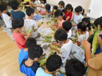 1校時、2年生全員でトウモロコシの皮むきをしました。