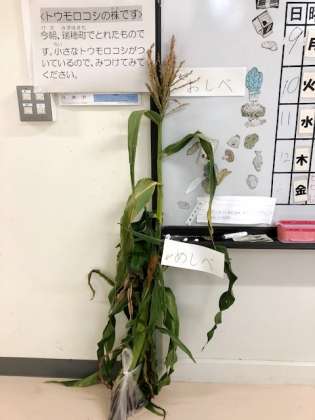 特別に1株だけトウモロコシの株をもらい、とうもろこしが畑でどのように実っているかみせました。本校は周りに畑がない地域なので、皮をむいたことはあるけれど、実際に実っているのは見たことがないという児童も多く、興味深々に観察していました。