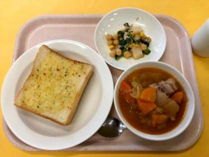 今日はとても暑い日となりました。子どもたちが30人以上集まるような教室は、冷房をきかせてもなかなか効きづらいそうです。暑さで食欲がわかないような児童も出ているようで、今日のメニューは子どもたちに食べてもらえるだろうかと心配していましたが、人気のあるガーリックトーストだったので、よく食べていました。