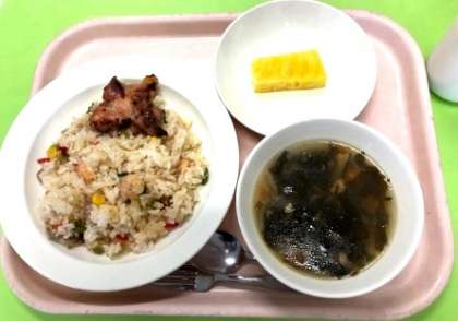 今日は南国のインドネシアメニューでした。サテ・アヤムは、鶏肉にニンニク、ショウガ、ネギといった香味野菜とチリパウダー、そして少しクセのある「アニス」というスパイスを使いました。低学年には食べ慣れない風味で抵抗があるかなと心配して給食時間中に見回りましたが、1年生からも「美味しかった!」という声が多く、よく食べていました。そして、石垣島産の「ティーダパイン」もとても甘くて、子どもたちは美味しそうに食べていました。