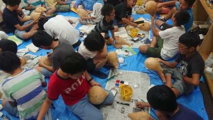 これから、ふくべ細工に挑戦です。栃木県特産のゆうがおの実に絵を描きます。あらかじめ考えてきた図案をもとに、お面など好きな飾りを作っています。