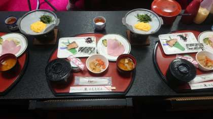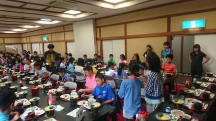 日光林間学園、朝食はご飯と味噌汁、おかずです。みんなと一緒の食事はいつもより食欲が出るのかもしれません。元気に食べています。