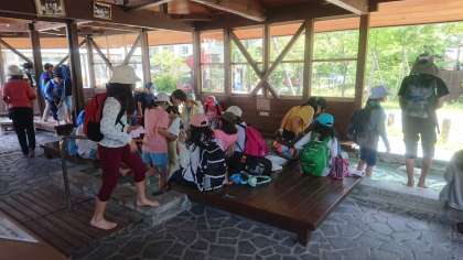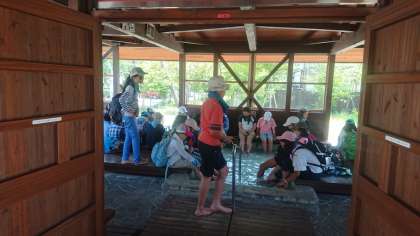 日光湯元源泉です。2手にわかれて、足湯と源泉です。足湯では熱い熱いと行っています。こんな体験も思い出の一つになることでしょう。