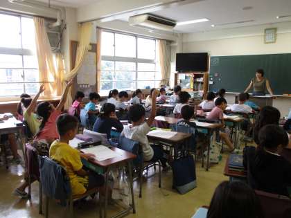 夏休み中に読んできた本の感想文を書く授業風景が、校内のあちらこちらで見られます。校内で選ばれた作品を区の読書感想文コンクールに応募するので、各学年がこの時期集中的に、読書感想文を書くことに取り組んでいます。