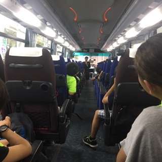 バスガイドさんの話を聞いています。社会科見学のはじまりです。