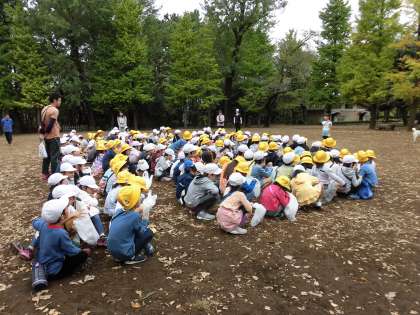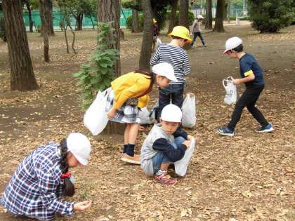 2年生が1年生をリードして、一緒に活動しました。落ち葉やドングリを探して、見つけては喜んでいた子どもたちです。