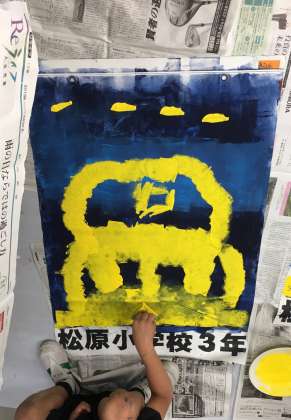 商店街に飾られる、ペナントの製作をしています。テーマは「ペタンペタン!夢のお城」です。一人一枚渡されるペナントは大きくて、運ぶのも大変です。