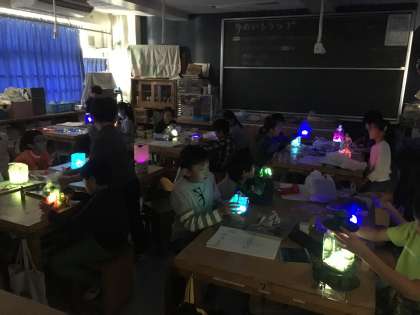 ペットボトルや、プラスチック素材を加工して、ランプをつくりました。紙より硬く、切り口が鋭利になるので、ハサミで切る向きに気をつけなければなりません。切った材料は、強力接着剤でくっつけます。光を通すと、いい感じになるにはどうしたらいいかな?何度も電気を消して光のもれかたを確かめながらつくり、完成後は