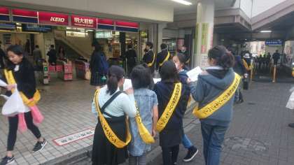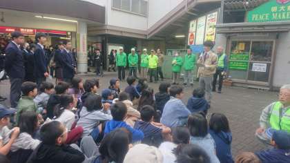 今朝は登校前に、明大前駅前でクリーンキャンペーンに参加した5年生です。駅前を通る人に、声をかけて自転車放置禁止を呼びかけたり、ティッシュを配ったりしました。駅前のゴミ拾いも積極的に行いました。
